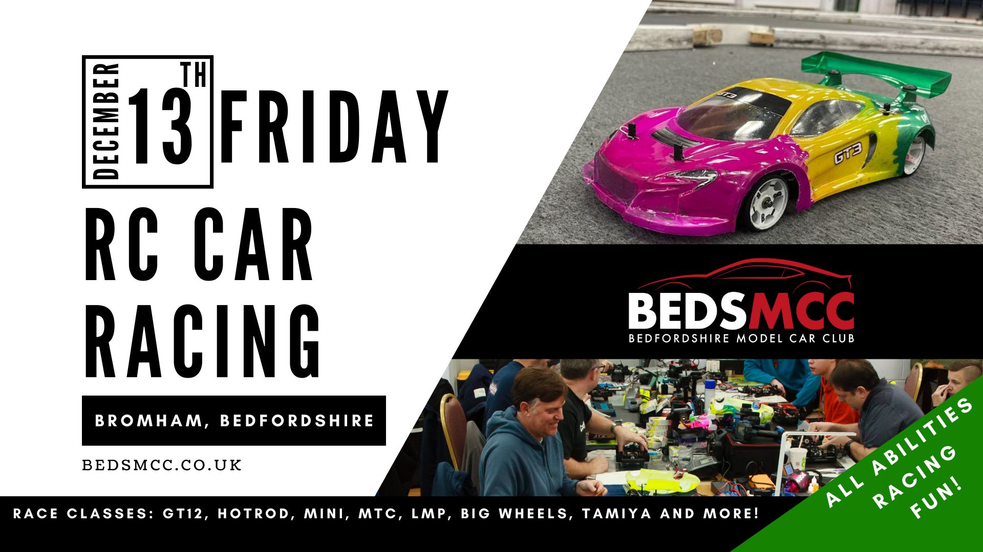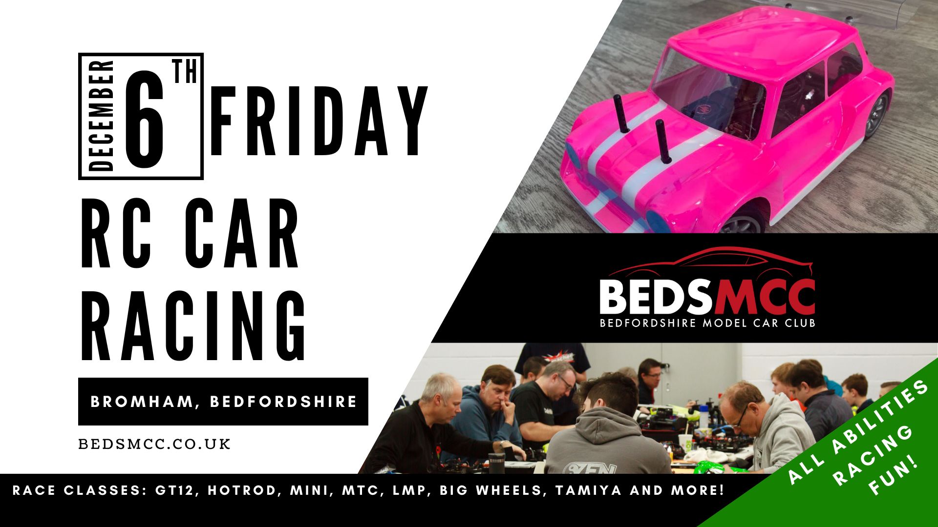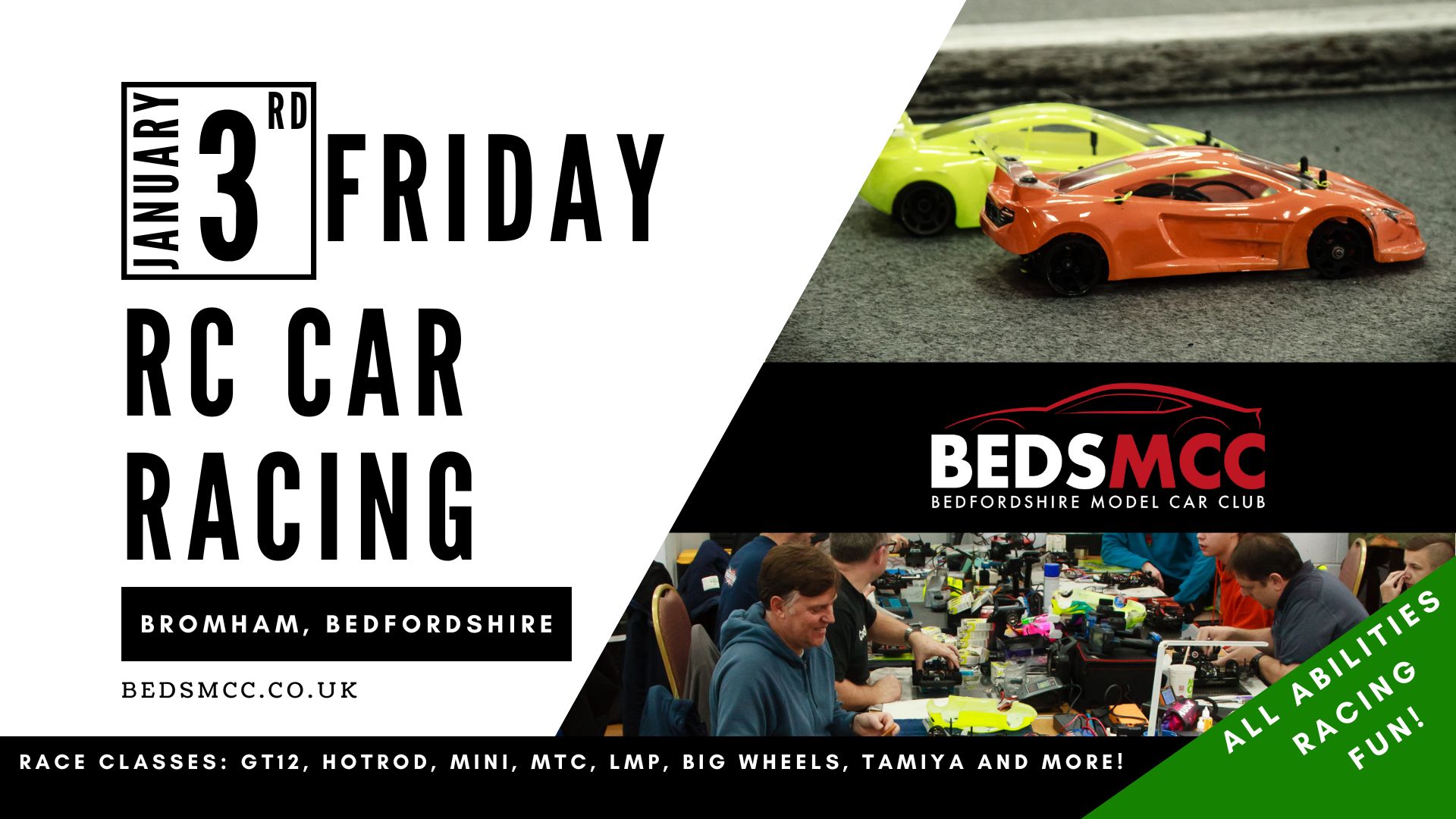 Facebook Event Link BedsMCC caters for RC car racers of all abilities racing ‘on-road’ classes indoors on prima-felt...