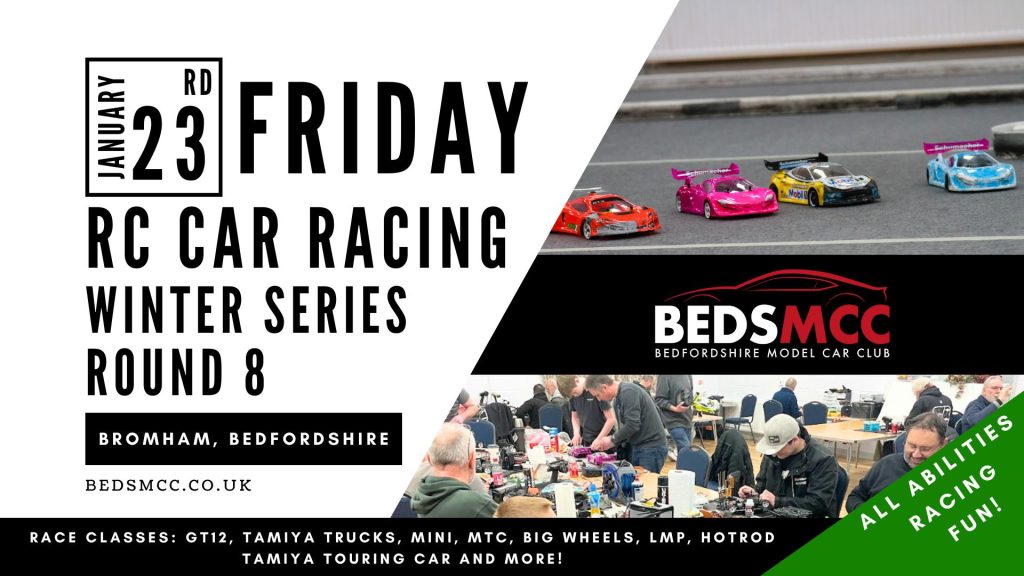 BedsMCC caters for RC car racers of all abilities racing ‘on-road’ classes indoors on prima-felt carpet at the Bromham Village Hall every Friday.